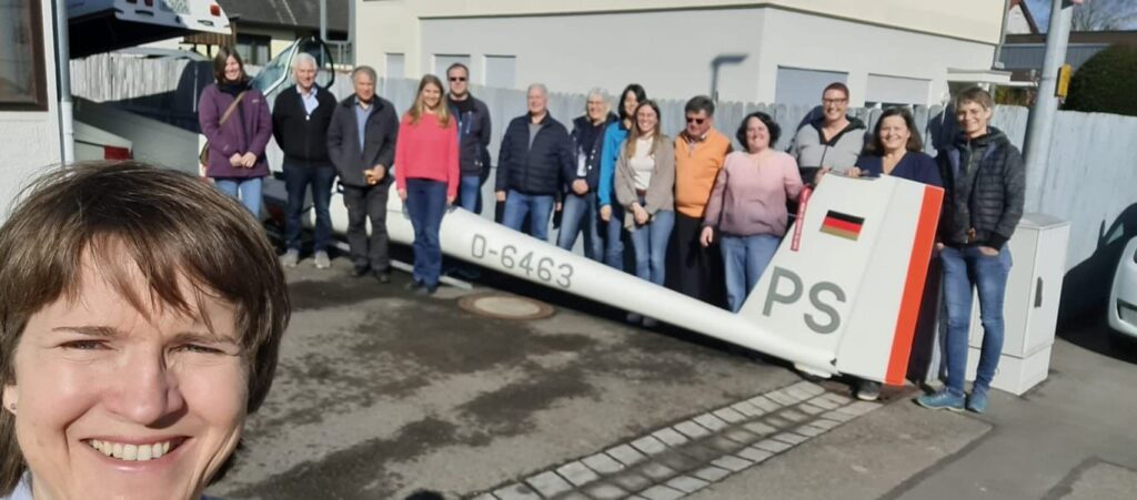 Einige der Teilnehmerinnen zogen nach der Hauptversammlung weiter auf die nahe gelegene Hahnweide. Dort standen die SF34 der Fliegergruppe Neckartal Köngen sowie deren Schleppmaschine und der AMF-Janus AM2 bereit. Die kurze Asphaltanrollstrecke ermöglicht fast den ganzen Winter über Flugbetrieb und das gute Wetter lockte einige ortsansässige Piloten auf den Platz, so dass ein reger Flugbetrieb entstand. Sechs Pilotinnen konnten den meist ersten Flug des Jahres 2024 in ihre Flugbücher schreiben. Jede war jeweils eine knappe Stunde in der Luft – und das am 2. März! Die Kombination aus Hauptversammlung und Flugbetrieb wurde so gut angenommen, dass das man dieses Set-Up auch für künftige Versammlungen einplant.